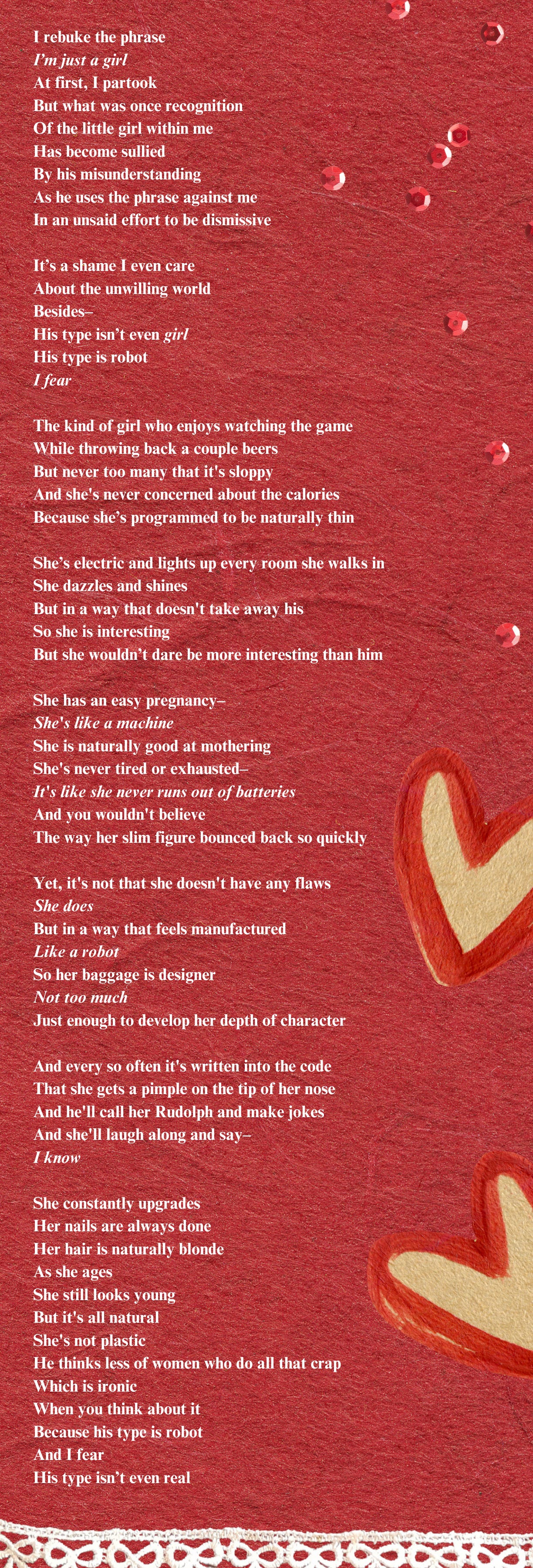 I’m just a girl! Girl dinner. Girl math. Girl hobbies. Girl, girl, girl. But, girl, does HE even enjoy girls? And, no, not like that. But sometimes, I wonder if his type is even girl, and I fear his type is robot — the vision of “girl” that has been coded into his brain. But, I seem to have some bugs in my system, and I’m okay with that because I’m not a robot and I’m not JUST a girl — I’m a flawed woman. I don’t want to fit the mold. Sometimes I go haywire, but that’s the beauty of it all.
